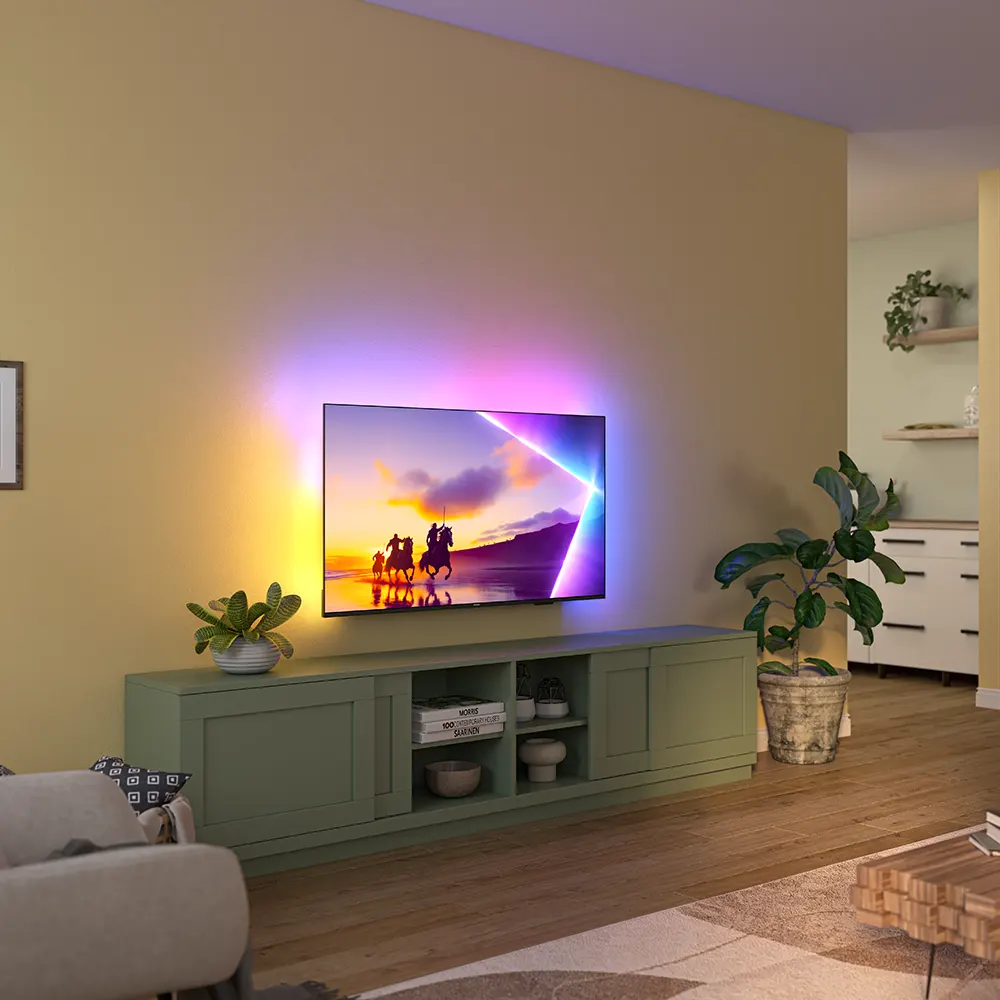 امبیشت در این مدل، طوری تنظیم شده که با محتوای در حال پخش همگام میشود. مثلاً در صحنههای هیجانانگیز، نورها تندتر چشمک میزنند و ضربان قلبتان را بالا میبرند، یا در لحظات آرام، نرم و ملایم میدرخشند تا حس آرامش را دوچندان کنند. فیلیپس این سیستم را به گونهای طراحی کرده که با موسیقی هم هماهنگ شود؛ تصور کنید یک کنسرت زنده را تماشا میکنید و نورها با ریتم درامها میرقصند، اتاق را به یک سالن خصوصی تبدیل میکنند.
