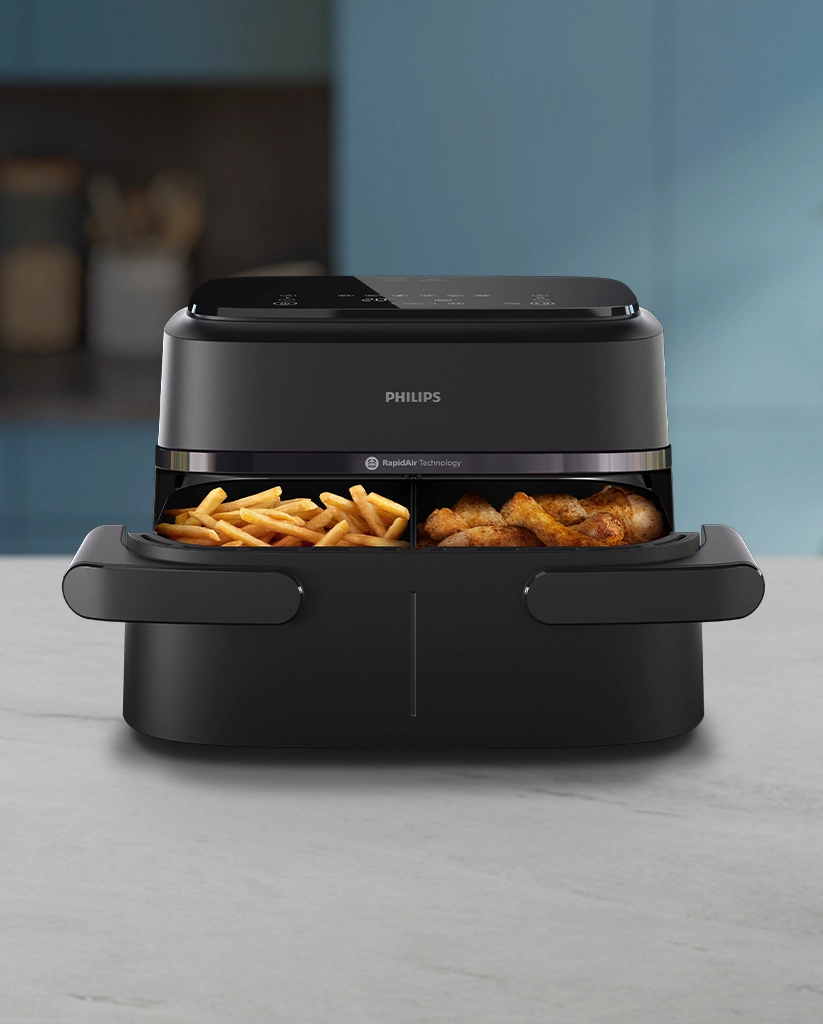سرخکن بدون روغن فیلیپس مدل NA150 (از سری ۱۰۰۰)، یکی از کامپکتترین هواپزهای دوسبده بازار است. با ظرفیت کلی ۷.۱ لیتر، امکان استفاده از دو سبد جداگانه (هر کدام حدود ۳.۵۵ لیتر) یا تبدیل به یک سبد بزرگ با حذف دیواره متحرک را فراهم میکند. فناوری Rapid Air با طراحی ستارهای منحصربهفرد، هوای داغ را به طور یکنواخت گردش میدهد و غذاها را ترد و آبدار با تا ۹۰٪ چربی کمتر آماده میسازد.