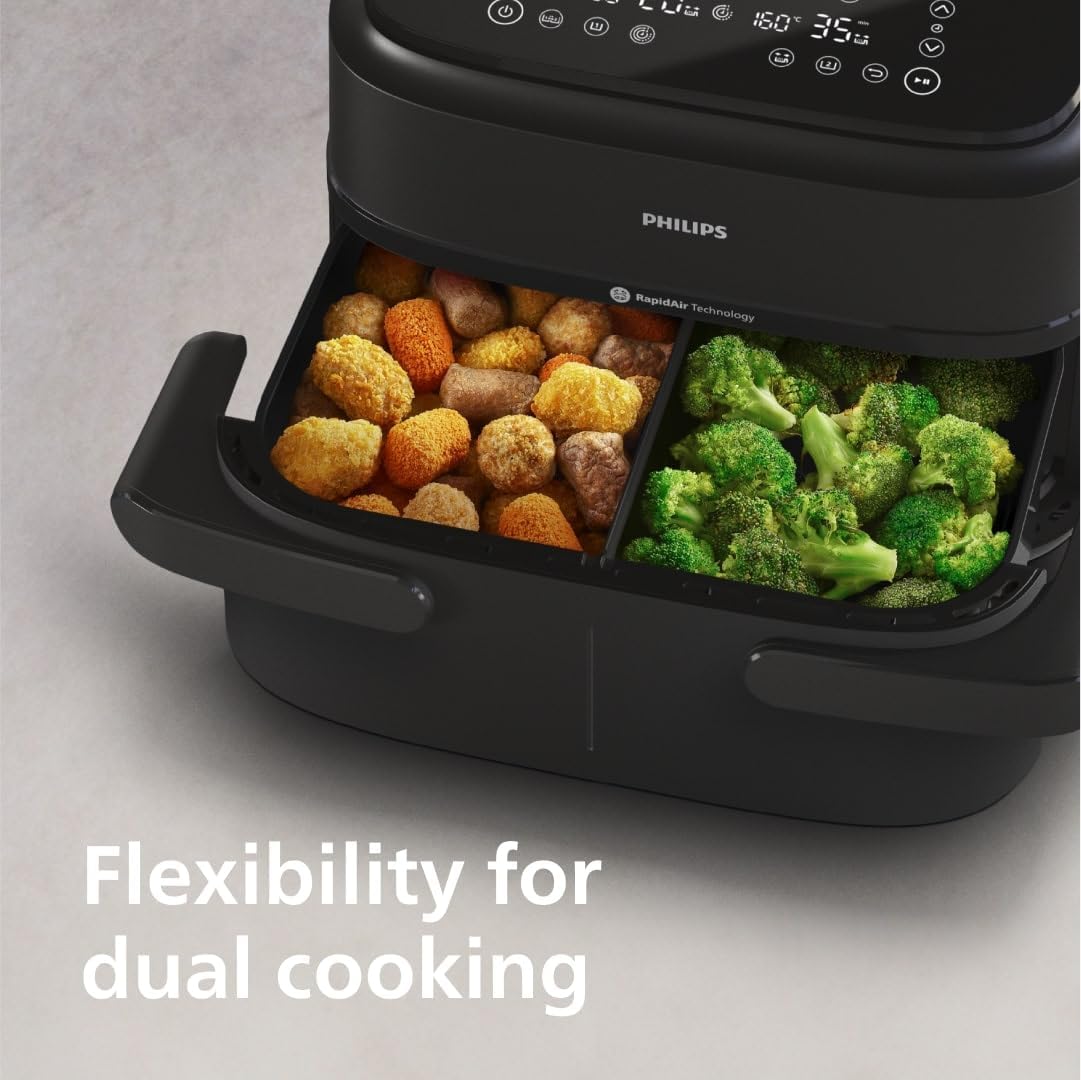 یکی از برجستهترین ویژگیهای سرخکن فیلیپس مدل NA150 ساختار دوسبدی آن است که امکان پخت همزمان دو نوع غذا را فراهم میآورد. این طراحی به کاربر اجازه میدهد تا مواد مختلف را بدون تداخل طعم یا زمانبندی جداگانه آماده کند. برای مثال اگر بخواهید پروتئین و سبزیجات را همزمان بپزید سبدهای مجزا این کار را ممکن میسازند و جریان هوا در هر بخش به طور مستقل عمل میکند تا نتایج یکنواخت حاصل شود.