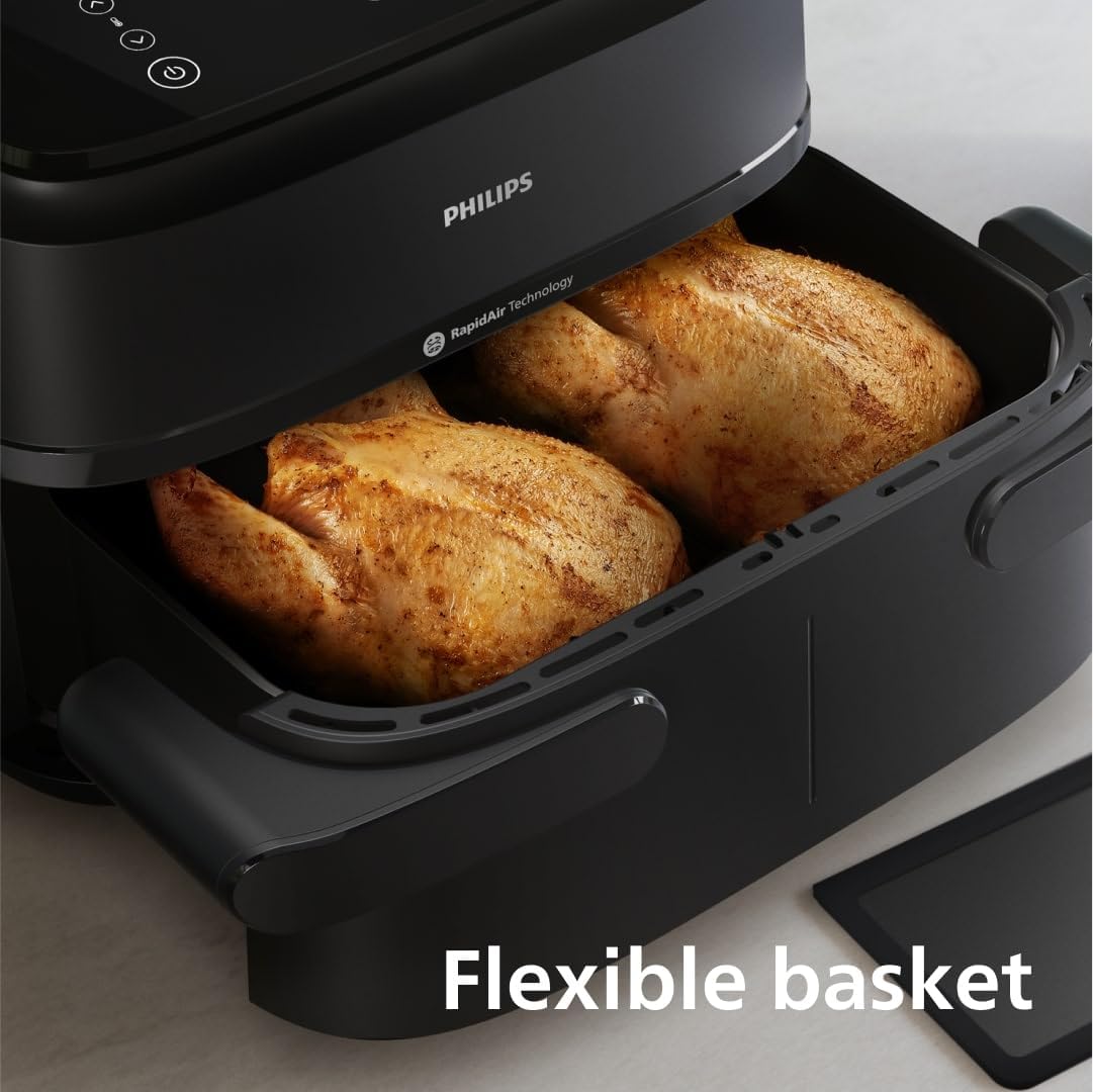 سرخکن بدون روغن فیلیپس مدل NA150 (از سری ۱۰۰۰)، یکی از کامپکتترین هواپزهای دوسبده بازار است. با ظرفیت کلی ۷.۱ لیتر، امکان استفاده از دو سبد جداگانه (هر کدام حدود ۳.۵۵ لیتر) یا تبدیل به یک سبد بزرگ با حذف دیواره متحرک را فراهم میکند. فناوری Rapid Air با طراحی ستارهای منحصربهفرد، هوای داغ را به طور یکنواخت گردش میدهد و غذاها را ترد و آبدار با تا ۹۰٪ چربی کمتر آماده میسازد.