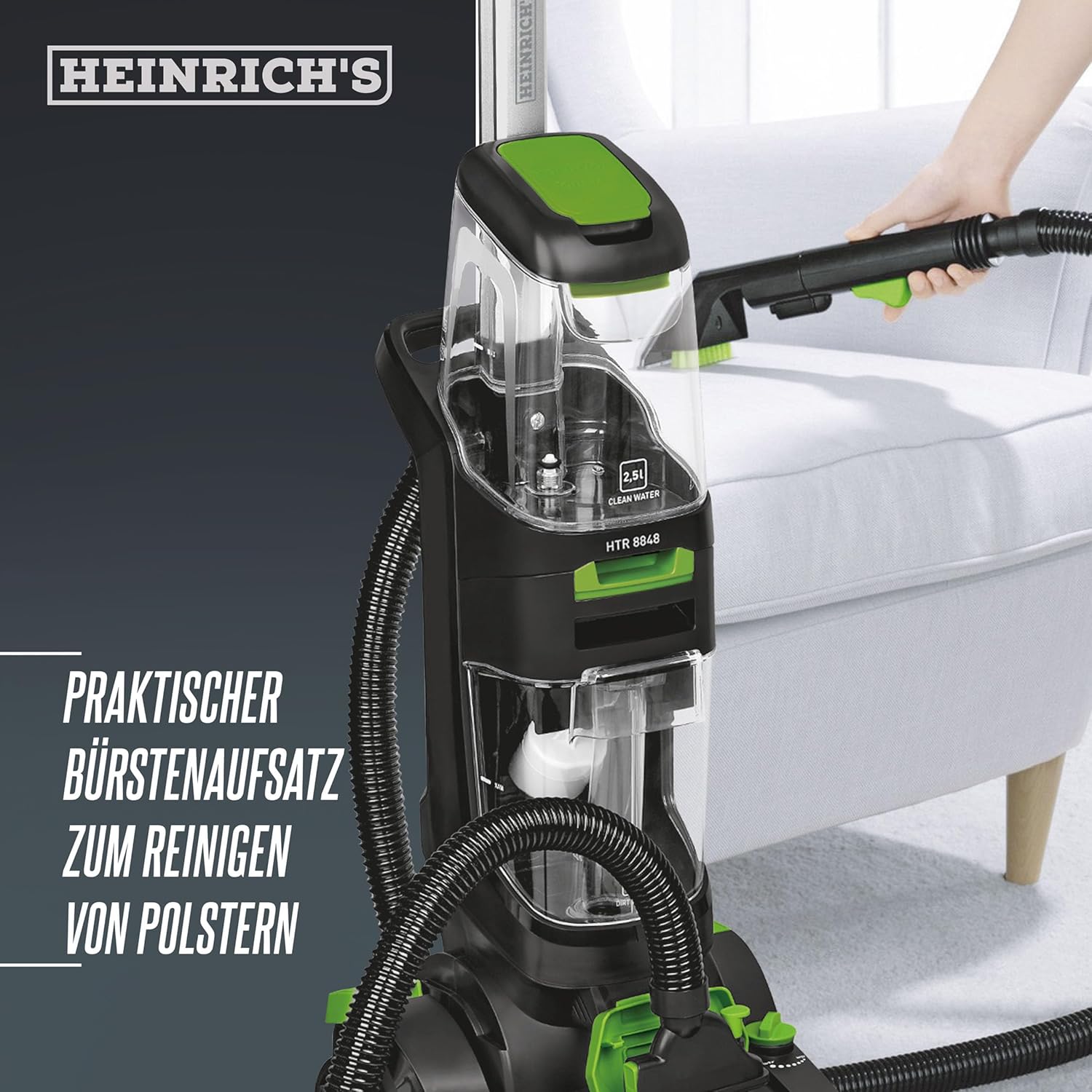 فرش شور و مبل شور هنریچ مدل HTR 8848 یک دستگاه نظافتی پیشرفته است که با طراحی ارگونومیک و بدنه مقاوم، شستشوی فرش، مبل و سطوح سخت را آسان میکند. سیستم برسهای چرخان با فناوری Rotate Pro آلودگیهای عمیق را بدون آسیب به بافت حذف میکند. لوازم جانبی متنوع، مانند برسهای دوقلو و لوله خرطومی منعطف، انعطافپذیری بالایی ارائه میدهند.