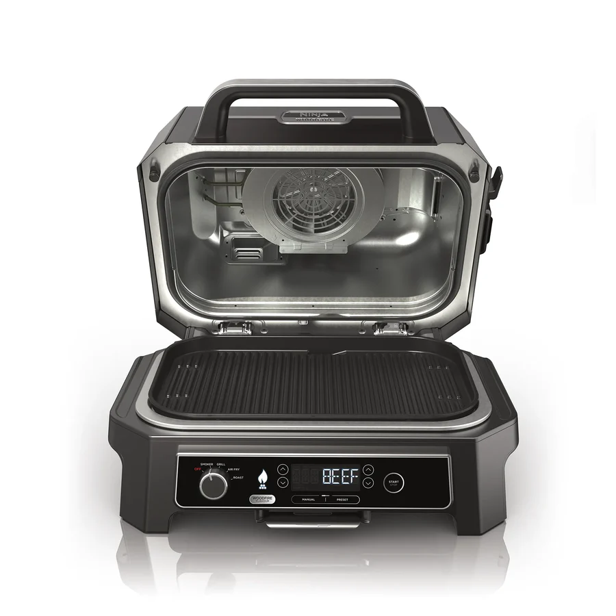 گریل باربیکیو نینجا مدل OG850 تجربهای کاملاً متفاوت از پخت در فضای باز را ارائه میدهد. قلب دستگاه تکنولوژی وودفایر است که با چوب طبیعی طعم دودی اصیل و عمیق را به تمام غذاها میبخشد؛ چه در حالت گریل مستقیم که سطح غذا را به زیبایی برشته میکند، چه در دودی کردن آهسته که گوشتهای بزرگ را نرم و پرطعم میسازد. حالت سرخ کن با گردش هوای داغ و طعم چوب، تردی بینظیری ایجاد میکند و حالت کباب حرارت یکنواخت و کنترلشدهای برای پخت کامل مرغ، گوشت یا حتی دسرها فراهم میآورد.