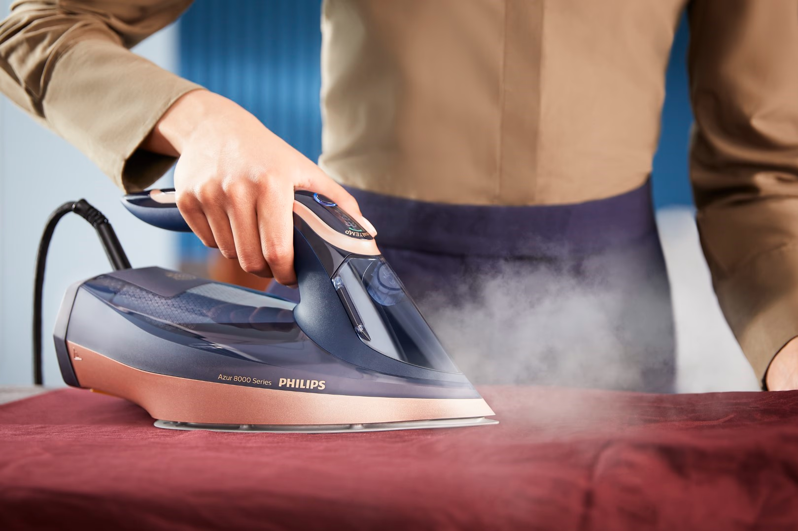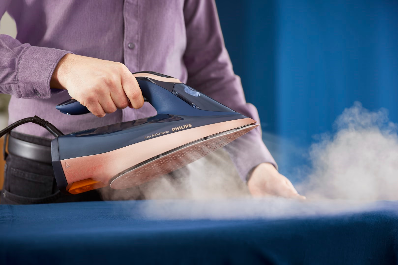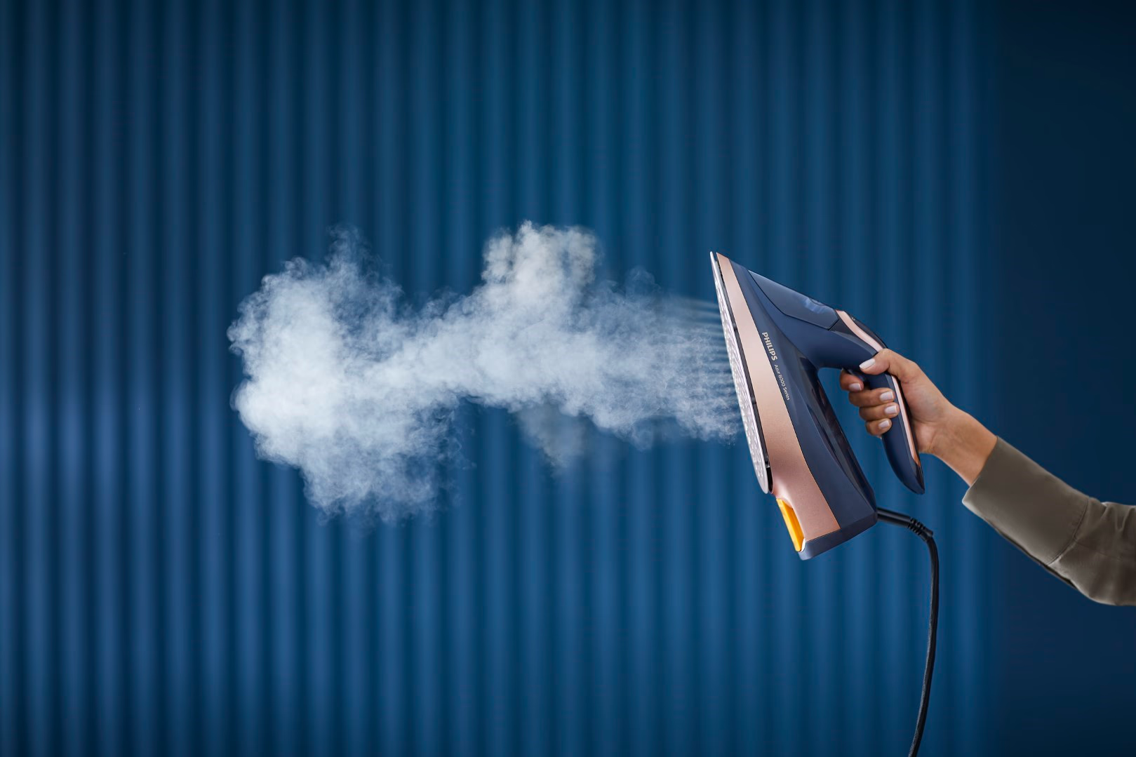 طراحی اتو بخار فیلیپس مدل DST8050 با دقت مهندسی بالا انجام شده تا تعادلی کامل میان زیبایی ظاهری، دوام ساختاری و راحتی در دست گرفتن ایجاد شود. بدنه آبی تیره با خطوط مدرن و ارگونومیک، وزنی معادل ۱٫۷۸ کیلوگرم را به همراه دارد که نه تنها حس استحکام میدهد بلکه در طول جلسات طولانی اتوکشی خستگی دست را به حداقل میرساند. دستهای نرم و انعطافپذیر با زاویه مناسب، کنترل دقیق حرکت را ممکن میسازد و نوک تیز اتو دسترسی آسان به نواحی دشوار مانند یقهها، آستینها و درزهای لباس را فراهم میآورد. طول سیم برق سه متری آزادی عمل بالایی ایجاد میکند و کاربر را از محدودیتهای مکانی رها میسازد، در حالی که طراحی جمعوجور مخزن آب ۳۵۰ میلیلیتری امکان پر کردن آسان حتی در حین استفاده را بدون اختلال در جریان کار میدهد. این مدل با توجه به اصول ارگونومی، توزیع وزن را به گونهای مهندسی کرده که فشار بر مچ دست کاهش یابد و حرکات طبیعی و روان باقی بماند،