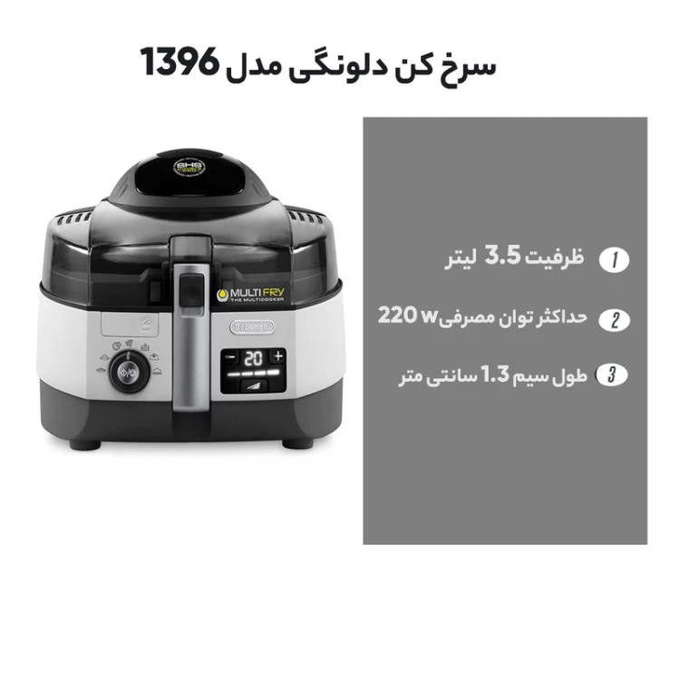 سرخ کن دلونگی چندکاره مدل FH1396 از جدیدترین و با کیفیت ترین سرخ کن های موجود در بازار می باشد که به تازگی توسط کمپانی دلونگی وارد بازار شده است .این دستگاه دارای توان 1400 وات با ظرفیت 3.5 لیتر می باشد. در ضمن از فناوری چرخشی سریع هوای گرم استفاده می نماید که مواد غذایی داخل سرخ کن را از همه طرف گرما داده و بدین ترتیب غذایی سالم و خوشمزه را به راحتی آماده می کند.